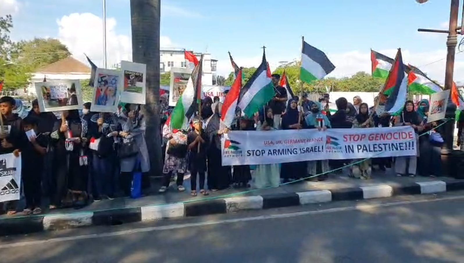 Dalam aksi ini tampak massa membentangkan dua spanduk besar bertuliskan “Stop Genocide in Palestine!” dan “USA, UK, Germany, Franch, Stop Arming Israel!”
