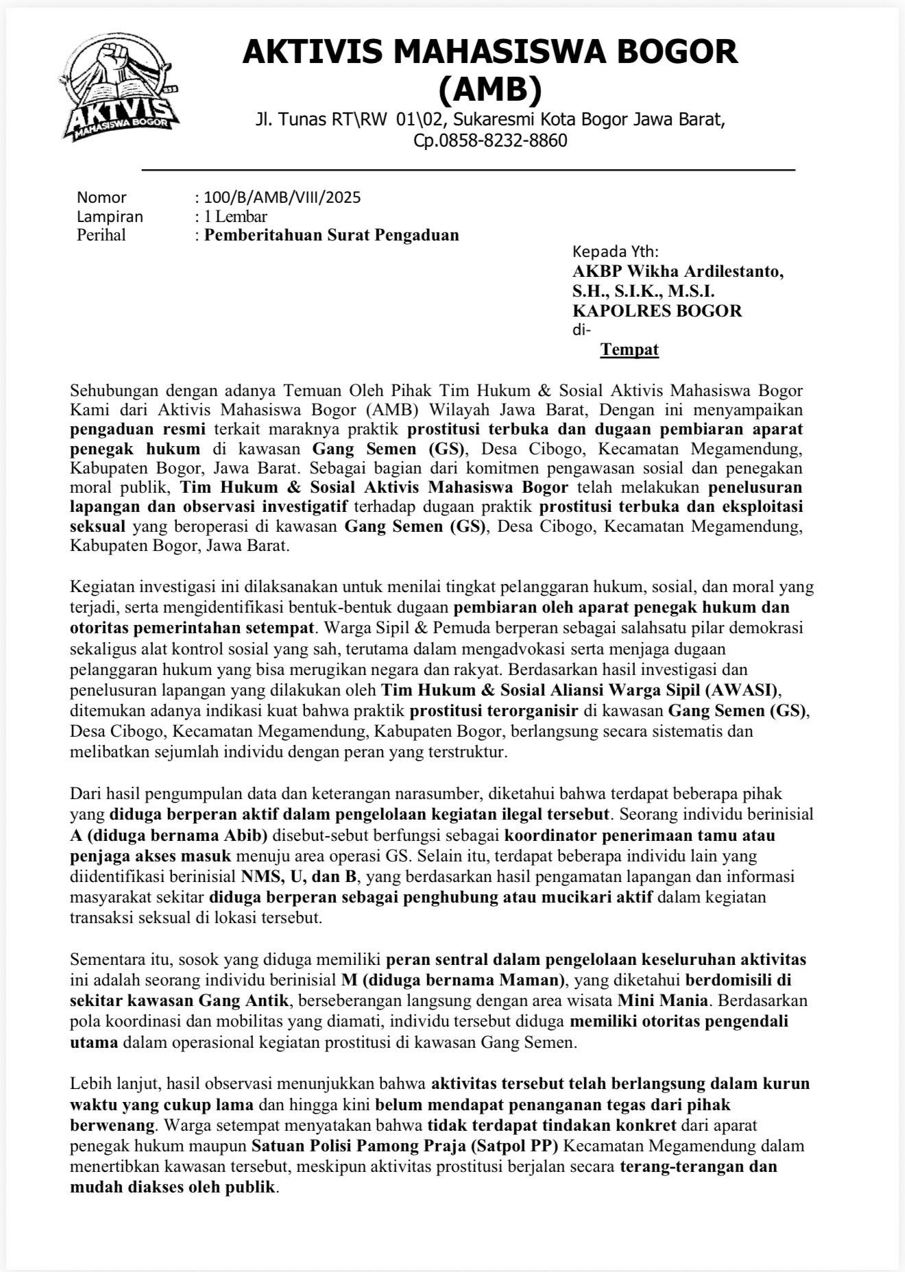 Bogor | LintasUpdate – Aktivis Mahasiswa Bogor (AMB) resmi melayangkan surat pengaduan kepada Kapolres Bogor, AKBP Wikha Ardilestanto, S.H., S.I.K., M.Si., terkait maraknya praktik prostitusi terbuka yang diduga beroperasi secara terorganisir di kawasan Gang Semen (GS), Desa Cibogo, Kecamatan Megamendung, Kabupaten Bogor, Jawa Barat. Senin (10/11/2025).