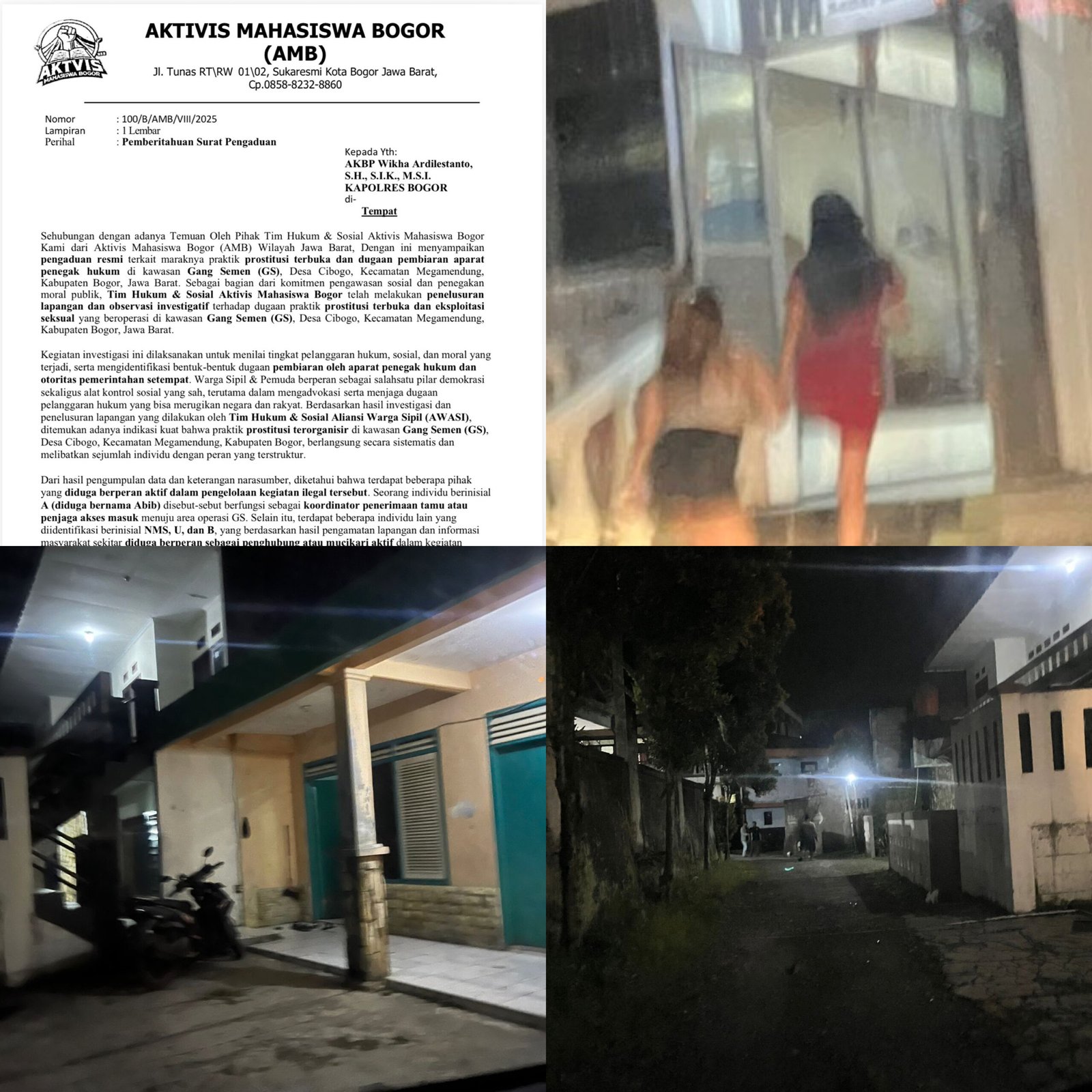 Bogor | LintasUpdate – Aktivis Mahasiswa Bogor (AMB) resmi melayangkan surat pengaduan kepada Kapolres Bogor, AKBP Wikha Ardilestanto, S.H., S.I.K., M.Si., terkait maraknya praktik prostitusi terbuka yang diduga beroperasi secara terorganisir di kawasan Gang Semen (GS), Desa Cibogo, Kecamatan Megamendung, Kabupaten Bogor, Jawa Barat. Senin (10/11/2025).