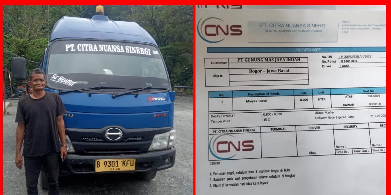 Peristiwa tersebut terpantau pada Sabtu (21/6/2025). Dari hasil investigasi tim LintasUpdate.co.id, diketahui bahwa armada tangki milik PT CNS dengan nomor polisi B 9301 KFU mengangkut 8.000 liter bahan bakar jenis diesel menuju PT Gunung Masjaya Indah (GMJ) yang berlokasi di Desa Rengasjajar, Cigudeg.