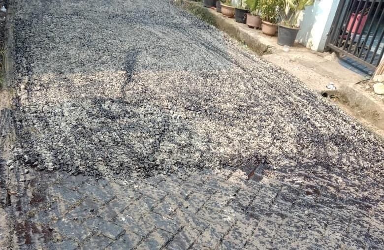 Kami melihat tidak adanya agregat yang di gelar malahan Paving Blok yang terlihat masih utuh dan layak malah di timpah dengan hotmix. Untuk ketebalannya pun tidak sesuai RAB.