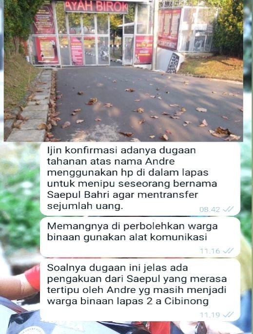 “Saya yang memberikan nomor petugas lapas atas nama Dadang ke S****l B***i. Untuk mencari tahu tentang Andre yang menipu S****l B***i, bahkan saya juga tertipu oleh Andre dan mentransfer sejumlah uang walaupun nominalnya tidak besar. Soalnya pengakuan Andre sudah keluar dari Lapas makanya saya berani mentransfer,” terang A***g kepada Awak Media.