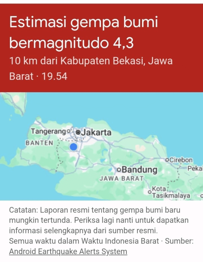 Bekasi | LintasUpdate – Guncangan gempa bumi dengan estimasi magnitudo 4,3 terjadi di wilayah Kabupaten Bekasi, Jawa Barat, pada Selasa malam pukul 19.54 WIB.