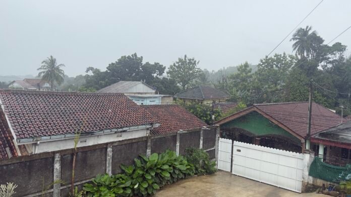 Dari dokumentasi warga, cuaca tampak mendung tebal dengan jarak pandang yang menurun akibat hujan yang turun merata. Atap-atap rumah terlihat basah disertai rintik hujan yang cukup konsisten, menandakan curah hujan tidak bersifat singkat.