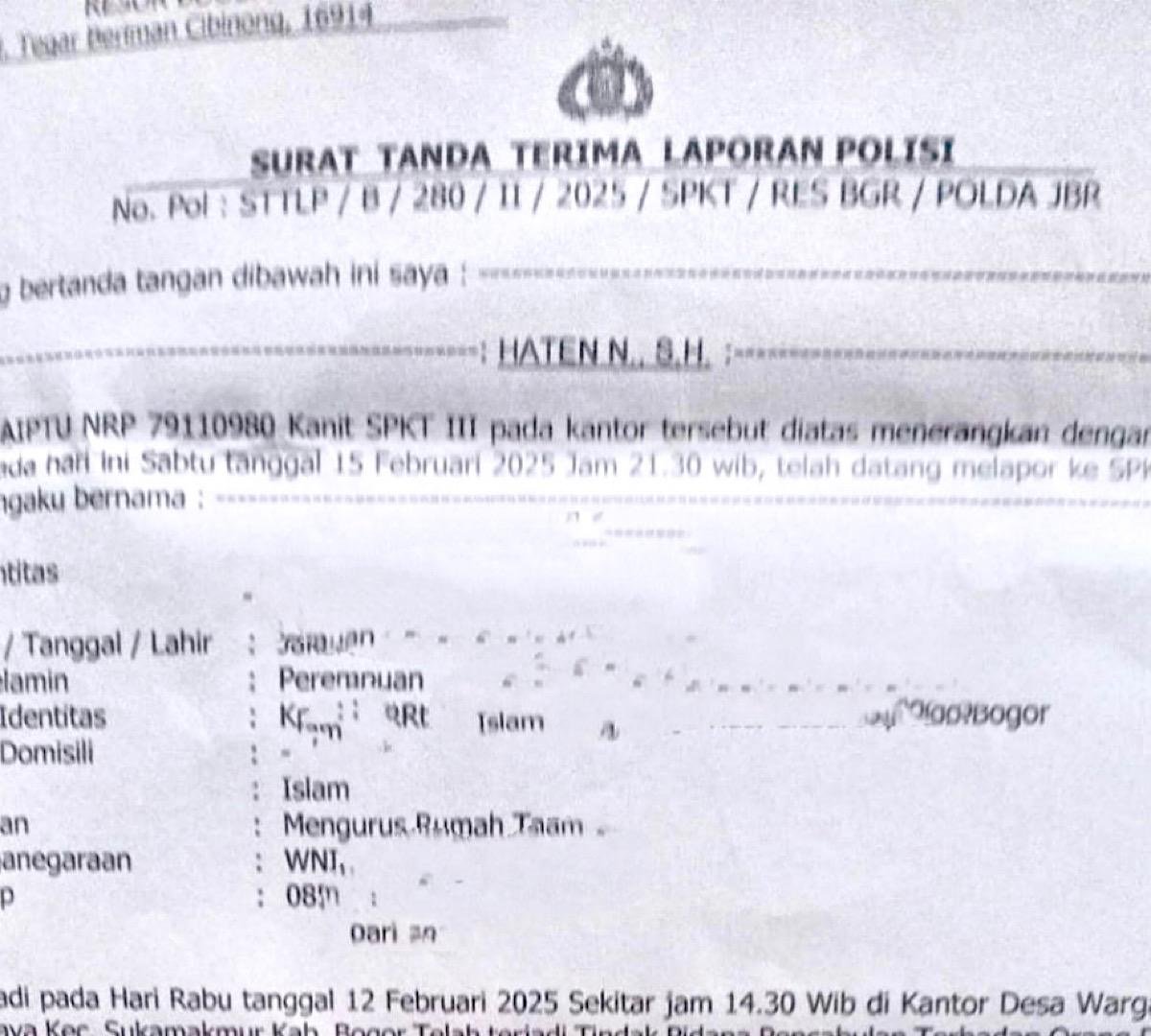 Bogor l Lintasupdate – Usai mediasi yang berlangsung ricuh, jurnalis wanita dari Kabar Daerah berinisial IN akhirnya mengambil langkah hukum dengan melaporkan Kades Wargajaya ke Polres Bogor atas dugaan pelecehan seksual. Laporan tersebut dibuat pada Minggu, 16 Februari 2025, dengan nomor STTLLP/8/28/11/2025/SKT/RES BGR/POLDA JBR dan ditandatangani oleh penyidik Aiptu Haten N, SH.