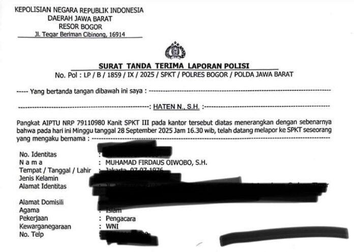 Berdasarkan dokumen Surat Tanda Terima Laporan Polisi (STTLP) dengan nomor: LP/B/1859/IX/2025/SPKT/POLRES BOGOR/POLDA JAWA BARAT, laporan diterima oleh Kanit SPKT III Aiptu Haten N., S.H., sekitar pukul 16.30 WIB.