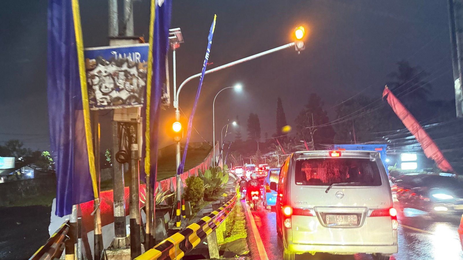 Hujan yang mengguyur kawasan tersebut sejak sore hari diduga menjadi salah satu faktor melambatnya laju kendaraan. Kondisi jalan yang menurun dan licin membuat pengendara lebih berhati-hati, sehingga arus lalu lintas tersendat di beberapa titik.