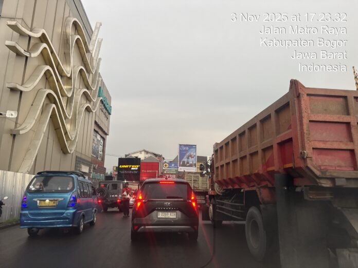 Bogor | LintasUpdate — Arus lalu lintas di Jalan Metro Raya, Cileungsi- Jonggol Kabupaten Bogor, Jawa Barat, terpantau padat merayap pada Senin sore (3/11/2025) sekitar pukul 17.23 WIB. Kemacetan terjadi di kedua arah jalan, tepat di depan kawasan pertokoan dan gedung pusat perbelanjaan.