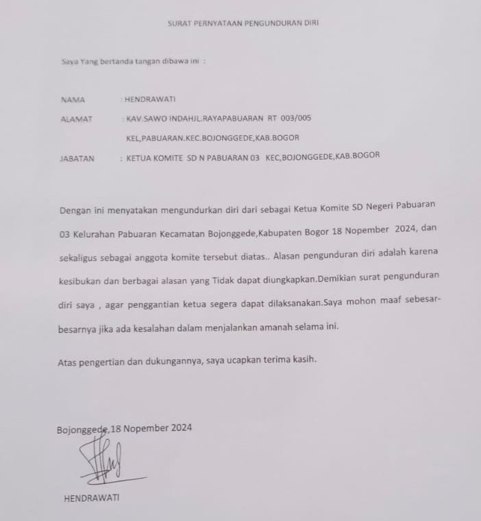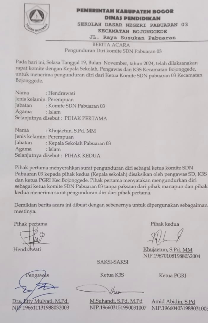 ” Dengan ini saya mengundurkan diri sebagai Ketua Komite SD Negeri Pabuaran 03, Kelurahan Pabuaran, Kecamatan Bojonggede, Kabupaten Bogor,” tulis Ketua Komite dalam surat pernyataan diatas Materai yang diketahui dan ditandatamgani oleh, Kepala Sekolah, Pengawas, Ketua K3S dan Ketua PGRI.