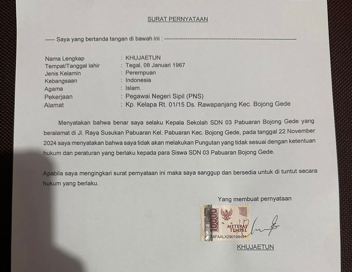 ” Menyatakan bahwa benar saya selaku kepala sekolah SDN 03 Pabuaran Bojonggede yang beralamat di Jl raya Susukan Pabuaran, Kelurahan Pabuaran, Kecamatan Bojonggede. Pada tanggal 22 Nomvember 2024 saya menyatakan bahwa saya tidak akan melakukan pungutan yang tidak sesuai dengan ketentuan hukum dan peraturan kepada siswa SDN 03 Pabuaran Bojong Gede. Apabila saya mengingkari surat pernyataan ini maka saya sanggup dan bersedia untuk dituntut secara hukum yang bsrlaku,” tulis dalam pernyataan tersebut, yang diterima Kilas Berita, pada Senin (25/11/24).