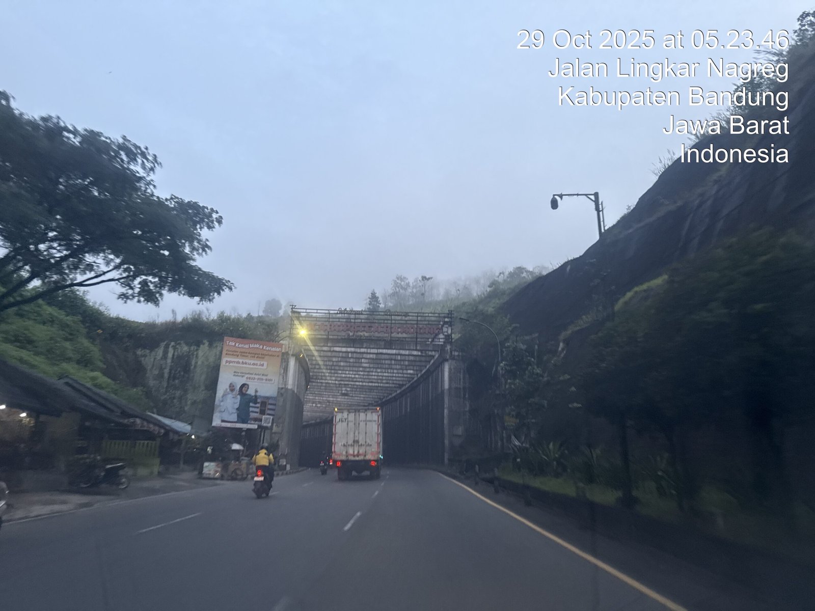Udara pagi di kawasan perbukitan ini tampak diselimuti kabut tipis, menambah suasana khas jalur Nagreg yang dikenal memiliki kontur jalan menanjak dan berliku. Meskipun jarak pandang sedikit berkurang akibat kabut, arus lalu lintas tetap terkendali.