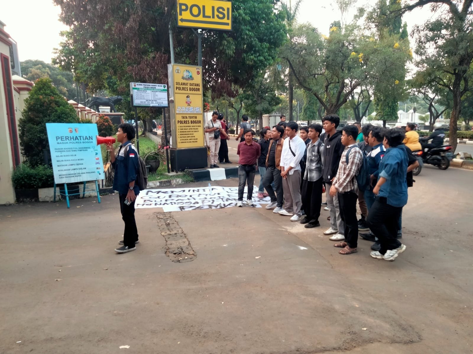 Aksi yang berlangsung tertib ini mendapat pengamanan langsung dari jajaran Polres Bogor. Mahasiswa berorasi dengan tertib, menyampaikan tuntutan mereka, dan menyerahkan pernyataan sikap kepada pihak kepolisian sebagai bentuk dorongan moral agar hukum ditegakkan secara adil dan transparan.