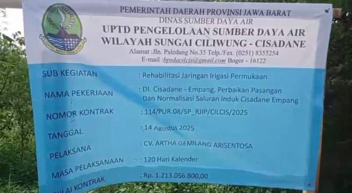 Bogor | LintasUpdate – Proyek rehabilitasi jaringan irigasi permukaan milik Pemerintah Provinsi Jawa Barat di bawah UPTD Pengelolaan Sumber Daya Air Wilayah Sungai Ciliwung–Cisadane, menuai sorotan publik. Papan informasi kegiatan yang terpasang di lokasi pekerjaan, tepatnya di saluran induk Cisadane Empang, Kabupaten Bogor, tidak mencantumkan keberadaan konsultan perencana maupun konsultan pengawas sebagaimana lazimnya pada proyek pemerintah.