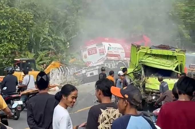 Menurut informasi awal di lokasi kejadian, salah satu kendaraan yang terlibat adalah sebuah truk tangki Pertamina.