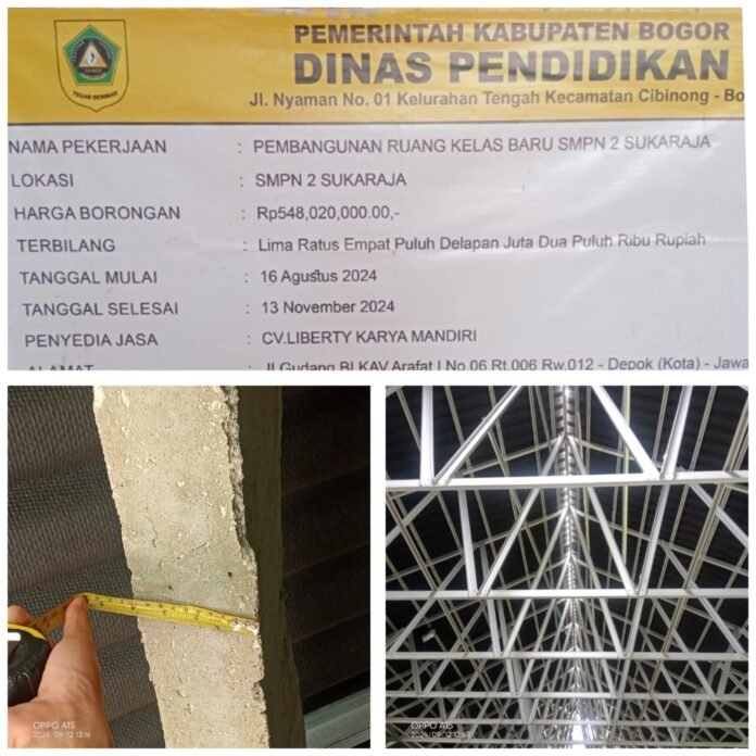 BOGOR | LintasUpdate – Banyak terlihat struktur bangunan seperti balok ring dalam kondisi terkelupas hingga terlihat besi tulangan pada pekerjaan konstruksi ruang kelas baru (RKB) pada sekolah SMPN 2 Sukaraja. Kamis (12/9/24).