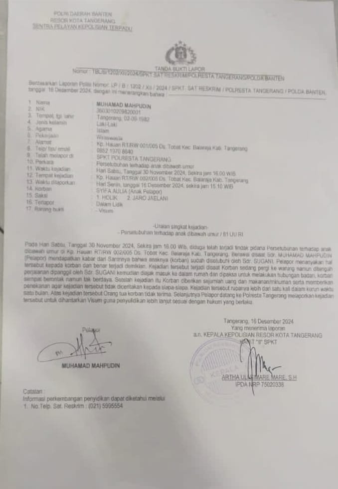 Pelaku bahkan meminta agar kasus ini tidak diviralkan dan memohon maaf kepada keluarga korban. Namun, keluarga korban tetap memilih untuk melaporkan kasus ini ke Polres Tangerang. Laporan tersebut tercatat dengan nomor LP/B/1202/XII/2024/SPKT. Tertanggal 16 Desember 2024.