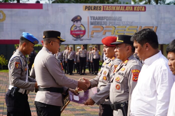 Polres Tasik Kota | LintasUpdate – Kapolres Tasikmalaya Kota AKBP Joko Sulistiono,S.H.,S.I.K.,M.H. Memberikan penghargaan kepada personel yang berprestasi dan masyarakat yang membantu tugas Pori dilaksanakan di Mapolres Tasikmalaya Kota, Senin (21/10/24)