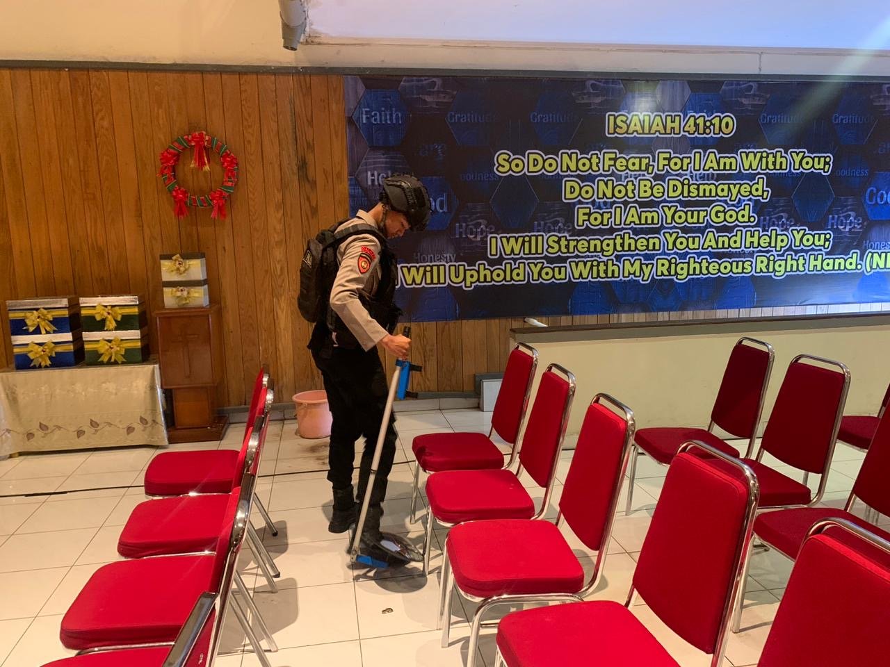 “Kami memeriksa setiap sudut gereja, termasuk tempat duduk jemaat, altar, pohon Natal, alat musik, serta area lainnya,” ujarnya.