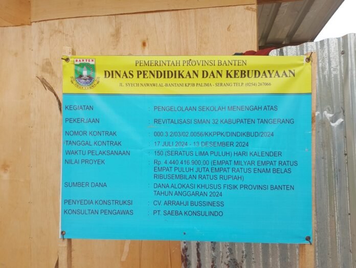 Tangerang | LintasUpdate – Revitalisasi Sekolah Menengah Atas (SMA) Negeri 32 Kabupaten Tangerang yang dilaksanakan oleh CV. Arrahji Bussiness diduga mengabaikan Keselamatan, Kesehatan Kerja (K3) dan dikerjakan tidak sesuai dengan spesifikasi, standar maupun kualitasnya. Sabtu, (07/09/2024).